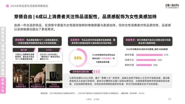 (快消品讯)昨日,知名数据研究机构CBNData发布了《我们的主张·2024女性品质生活趋势洞察报告》,深入剖析了女性消费者在当下社会背景下的消费选择与主张,展现了女性消费进入“悦己2.0时代”的崭新面貌。