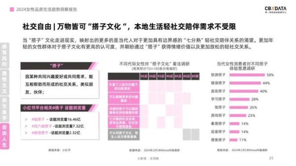 此外,以“搭子文化”为代表的轻社交模式也在女性群体中悄然兴起。无论是旅游搭子、逛街搭子还是学习搭子,这种“七分熟”的社交关系既提供了陪伴,又给予了个体足够的自由度与选择空间。这种新型的社交方式不仅丰富了女性的生活体验,也反映了她们对自我探索和人际交往的独特理解。