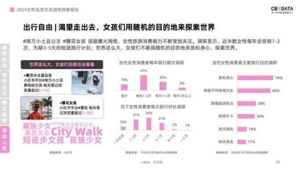 与此同时,旅行成为女性释放自我、探索世界的新途径。她们不仅追求身心的放松,更渴望通过旅行体验不同的地域文化,探索新的旅游方式。从Citywalk到“特种兵旅行”,从沉浸式旅拍到短徒步,女性们在旅行中展现出无限的创意与活力,为旅游经济注入了新的活力。