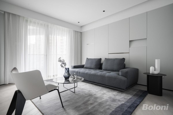 客厅无电视,极简储物柜与玄关相互呼应, 底部安装壁炉,为素雅的家增加色彩与温馨。 黑白对比、虚实相间,开放层架可做收纳与展示, 艺术造型的摆件体现屋主的高阶审美。