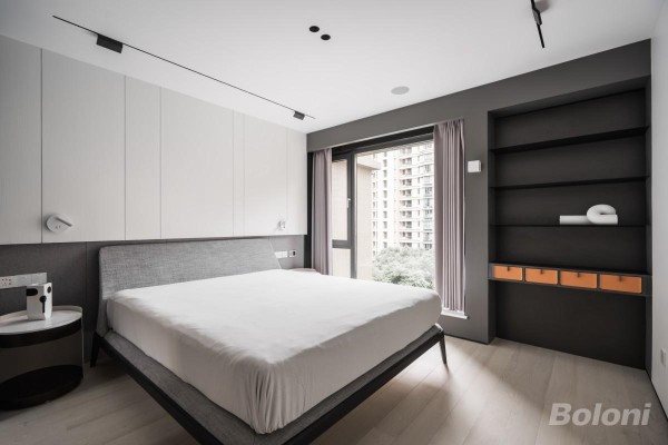 走廊尽头的主卧,用镂空柜体做视觉焦点,隐形踢脚线和超薄门套,让空间更精致入墙式的隐形衣柜拓展收纳空间,高级灰的质感与色调美化视觉体验。
