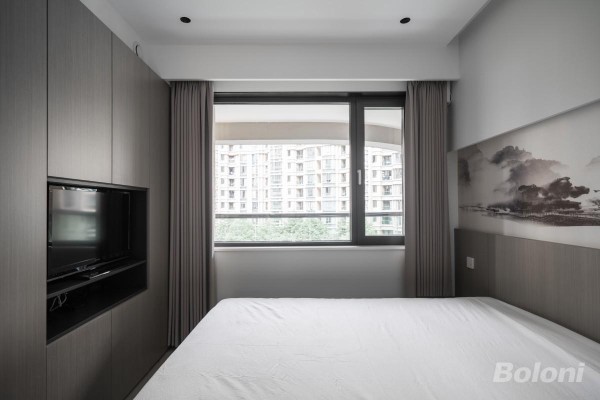 具有吸音效果的硬包做床头背景墙,淡雅舒缓的色调,营造静谧舒适的睡眠空间。水墨画的背景墙意境感十足,嵌入式电视更加方便。