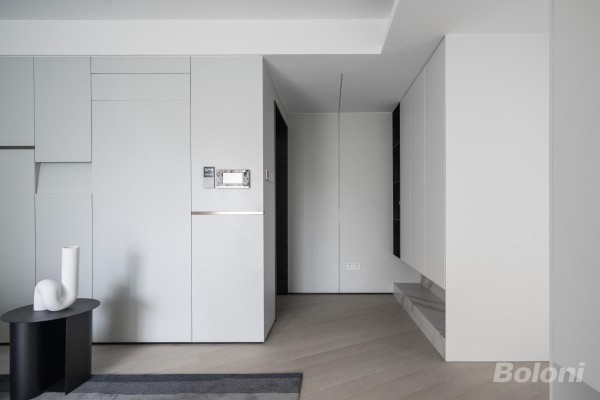 通往餐厅和卧室的走廊由储物间构成, 炫酷的灯光将其装扮成精致的艺术装置。 纯白的墙面将储物室的门隐藏其间, 不规则的线性灯,营造个性独特的未来感。