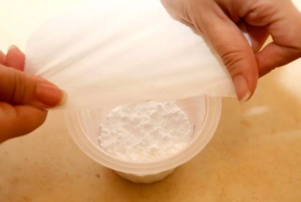 在布丁杯或纸杯中装入小苏打粉,盖上厨房纸巾或面纸。再以橡皮筋固定边缘,就不用担心打翻。