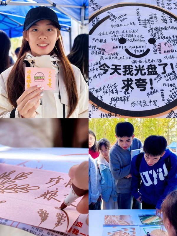 本次活动以“线下实践+认知深化”为主线,将节约理念融入生动有趣的互动体验中,让“光盘行动”蔚然成风,推动节粮惜食成为校园里一道亮丽的风景线。在“一粒米的旅行”主题绘画展中,同学们用五彩斑斓的画笔,生动描绘了粮食从田间播种、辛勤耕耘,到历经风雨、最终走上餐桌的漫长而艰辛的旅程。一幅幅画作不仅展现了同学们的艺术才华,更通过搭配的粮食科普文字,直观地向观者传递了“谁知盘中餐,粒粒皆辛苦”的深刻内涵,让每一位驻足者都对“一粥一饭”的来之不易有了更切身的感悟。“辨粮知辛·珍惜不易”知识问答活动通过识别各类农作物、讲述其种植过程与生长周期等形式,寓教于乐,极大地激发了同学们对农业知识的兴趣。在一问一答之间,大家不仅收获了知识,更深刻体会到粮食生产背后所付出的辛勤汗水,进一步增强了珍惜粮食的自觉性。“吃光盘,迎笑脸”活动成为食堂里最温馨的场景。同学们在享用完“光盘”餐后,纷纷在食堂出口处拿起笔,在便签上写下自己的节约标语,如“今天你光盘了吗?”“拒绝‘剩’宴,从我做起”,并与自己的“作品”合影留念。一张张灿烂的笑脸,一句句真挚的标语,汇聚成一股强大的正能量,让“光盘”不再是一句口号,而是化为了同学们自觉践行的文明新风尚。