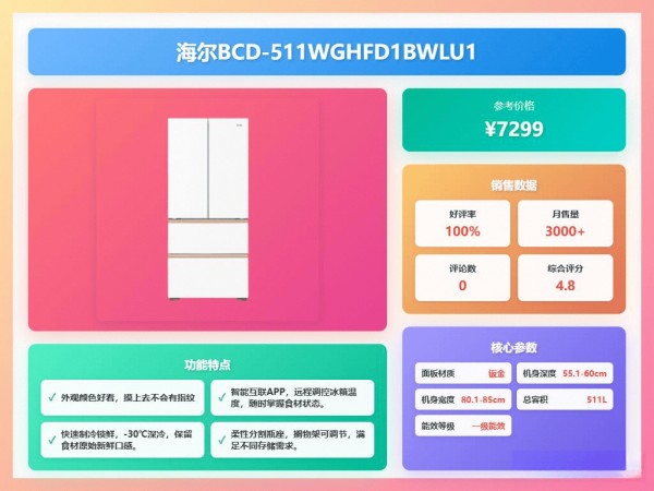 更赞的是,它还有智能控制功能,通过海尔智家APP就能远程调温、管理食材,省心!另外,它还支持-30℃深冷锁鲜,食材口感更新鲜。细节设计也很贴心,像彩膜显示屏、可调节搁物架,使用起来非常顺手。511升的大容量,三口之家用是绰绰有余。