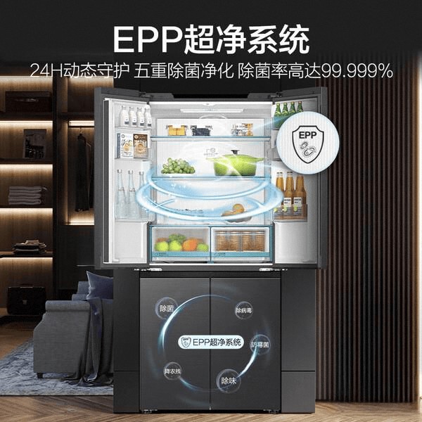 在保鲜方面,这款冰箱搭载了全空间保鲜技术,干湿分储、智能恒温,食材放进去营养不流失。EPP超净系统能去除99.999%的细菌和异味,食品安全有保障,吃得更放心。制冷效果也很快,运行声音很小,使用体验非常好。