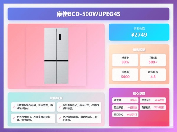 这款康佳冰箱的亮点在于60cm超薄机身,能够嵌入式安装,非常适合厨房空间有限的朋友!500升的容量足够一家人使用,十字对开四门设计可以分类存放,避免串味,使用起来更顺手。