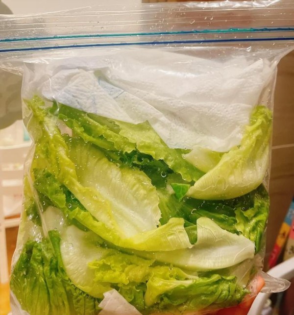 处理的时候,去掉绿叶菜的根部,洗干净、沥干水分,用厨房纸包好,再放进保鲜袋里面,这样收纳绿叶菜,可以延长保鲜时间。
