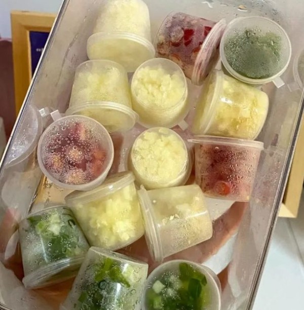 把这些配料切一下,然后装进保鲜袋里面,放进冰箱冷冻即可,吃的时候,取出来一点。