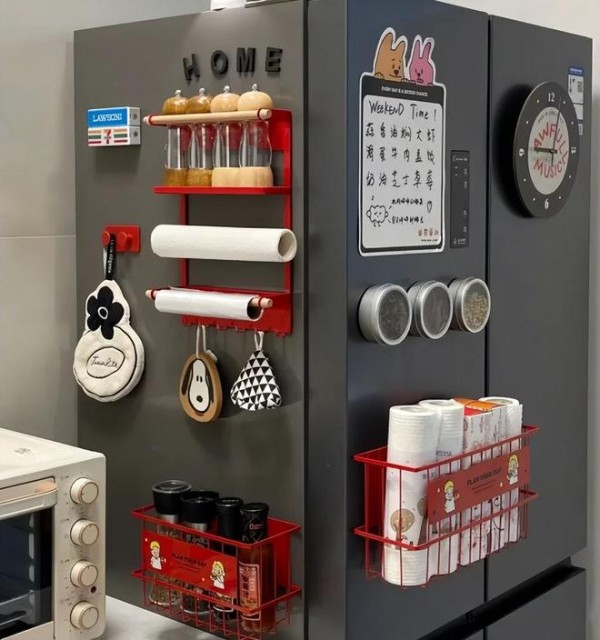 把这些磁吸的置物架固定在冰箱门外面,可以用来收纳各种杂物。