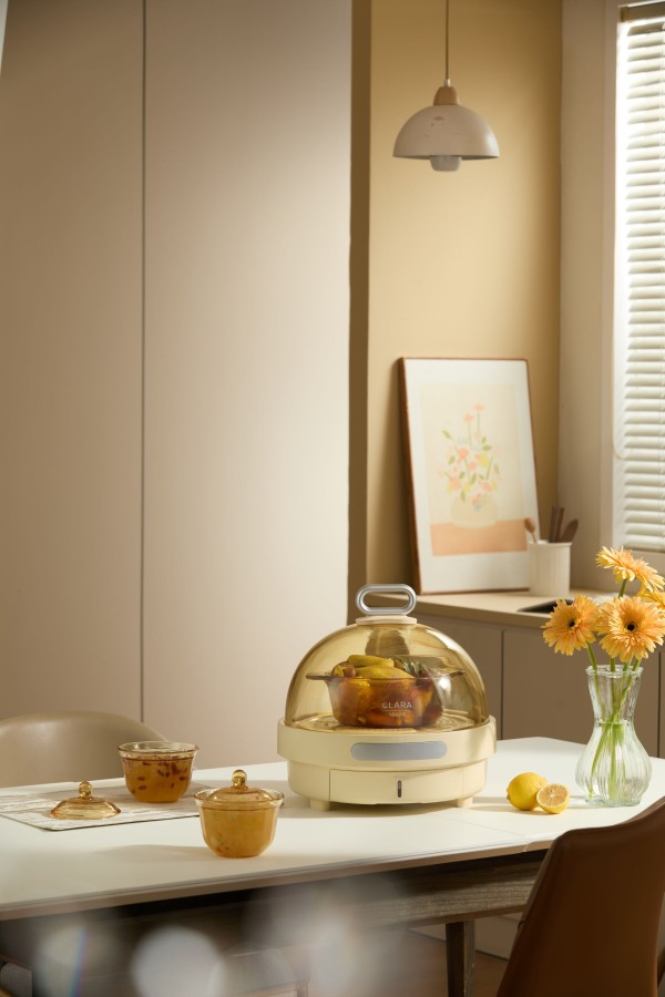 传统厨电品牌常陷入“参数竞赛”,而CLARA与康宁的合作始于对用户真实需求的洞察。例如,针对用户对冷凝水影响食物口感、玻璃盖易沾污渍、圆形餐具放置不平等痛点,Clara采用康宁的高硼硅玻璃作为电蒸锅穹顶穹顶。这种材质不仅具备-20℃~250℃的耐温区间,更通过琥珀色镀膜减少强光刺眼,让用户能清晰观察食物状态却无需担心眩光干扰;同时,蒸汽在穹顶内壁均匀凝结后沿弧面滑落至底部发热盘二次蒸发,而非直接滴入食物。
