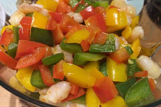 【食材】:彩椒、虾仁、盐、料酒、水淀粉