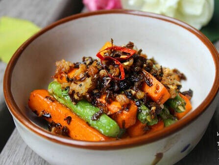 【食材】: 南瓜100克、豆角100克、肉末20克、碎米芽菜10克、姜蒜末适量、花椒适量、干辣椒段适量