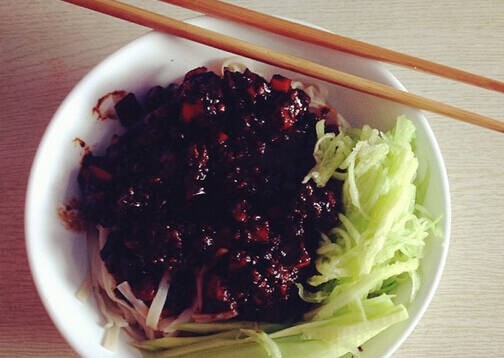 6)倒入炒好的炸酱 放上黄瓜丝 完成