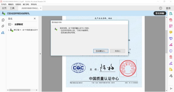 从内容和样式上来看,电子证书内含认证证书的正文和附件(如有)、或者变更结论书,它的样式和内容与纸质证书基本一致,只是没有证书底部的纸号。它以PDF格式文件为载体,“中国质量认证中心”印章中签有中心专用电子签名。