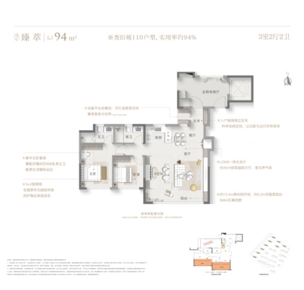 建筑面积约 110 平方米的三室两厅两卫户型,专为改善型客群打造,居住舒适度极高。该户型采用经典的三开间朝南设计,客厅、主卧、次卧均朝南,采光面宽达 10.2 米,室内光线充足,通风效果极佳。客厅面宽达 4.0 米,与南向宽景阳台相连,阳台进深 1.8 米,可作为休闲区、晾晒区或观景区,功能多样。主卧采用套房设计,配备独立卫生间和衣帽间,私密性强,居住舒适度高;主卧面宽约 3.5 米,配备全景飘窗,视野开阔,让业主在室内就能享受充足的阳光和优美的景色。两个次卧面积适中,可作为儿童房或长辈房,布局合理,互不干扰。厨房采用 U 型设计,操作空间宽敞,动线流畅,同时与餐厅相邻,用餐方便。公共卫生间干湿分离,位于两个次卧之间,使用起来更加便捷。该户型空间布局合理,功能齐全,舒适性高,非常适合追求品质生活的三口之家或四口之家。