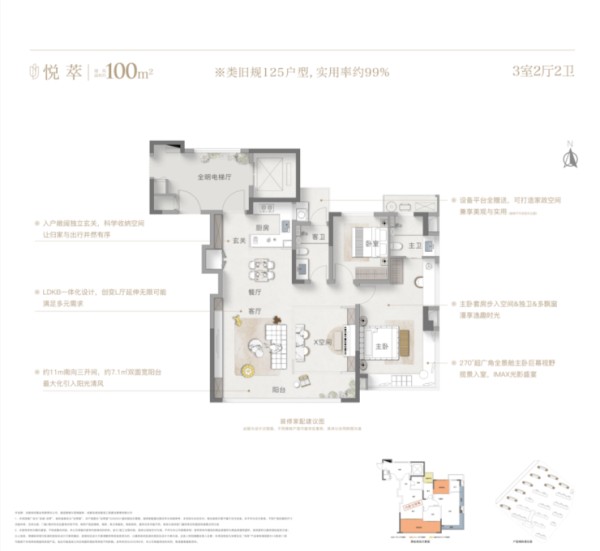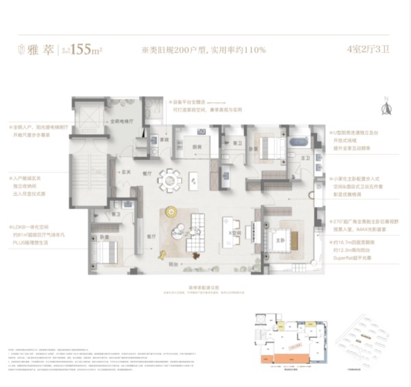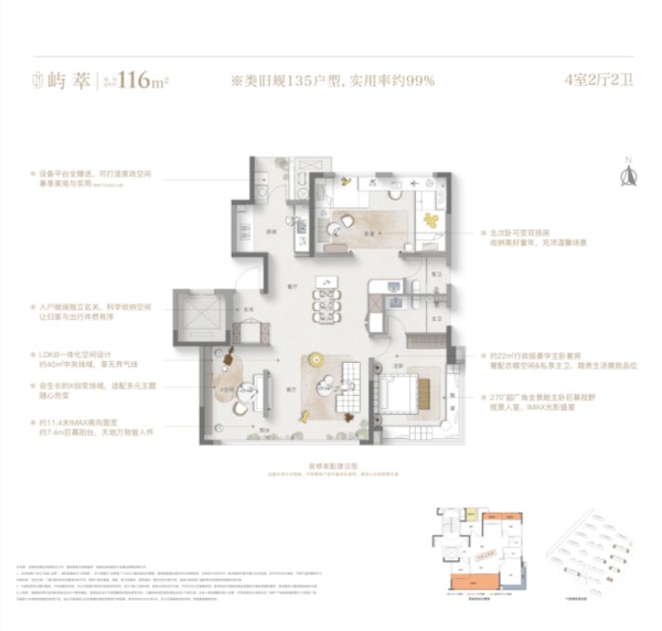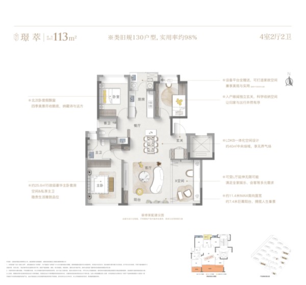 建筑面积约 125 平方米的四室两厅两卫户型,是终极改善型客群的首选,空间阔绰,功能完善。该户型采用大横厅设计,客厅面宽达 4.8 米,与南向超大阳台相连,阳台面宽与客厅一致,视野开阔,空间感十足,无论是家庭聚会还是朋友宴请,都能轻松容纳。四开间朝南,客厅、主卧、两个次卧均朝南,采光面宽达 13.5 米,室内光线充足,通风效果极佳。主卧套房设计,配备独立卫生间、衣帽间和全景飘窗,空间阔绰,私密性强,居住舒适度极高;衣帽间收纳空间充足,满足业主的衣物收纳需求。两个南向次卧面积适中,可作为儿童房或长辈房,采光充足,居住舒适;北侧次卧可改造成书房、茶室或客房,满足家庭多样化的居住需求。厨房采用 U 型设计,操作空间宽敞,动线合理,同时预留了双开门冰箱位置,储物空间充足。公共卫生间干湿分离,布局合理,使用便捷。该户型空间阔绰,功能完善,居住舒适度高,能够满足大家庭的居住需求,是改善型购房的优质选择。
