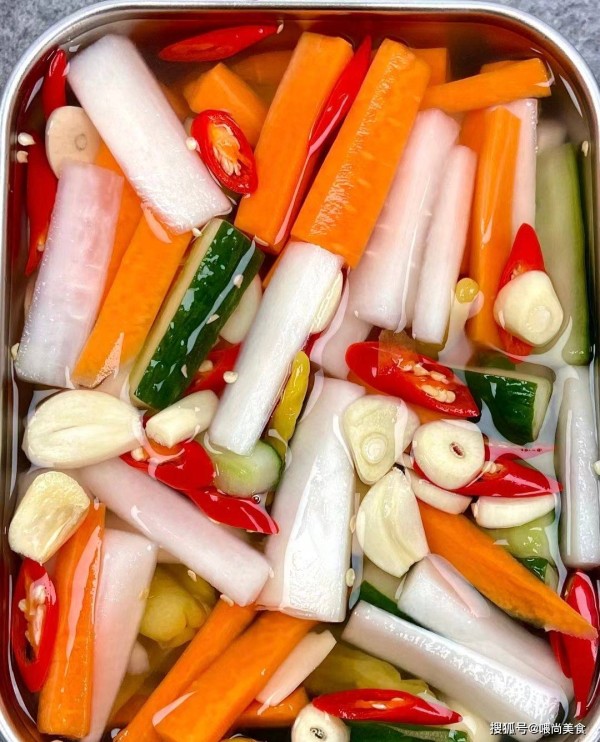 步骤1、萝卜、胡萝卜、青瓜切条加入两勺盐腌制1小时,再把腌出来的水倒掉,清洗干净,沥干水分。