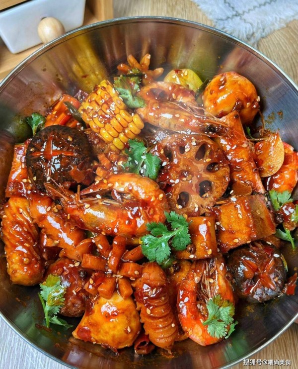 各种丸子、虾、莲藕、香菇、玉米、芋头配料:火锅底料、豆瓣酱、生抽、蚝油、糖。