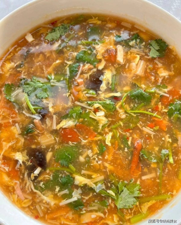 蕃茄2个、豆腐半块、胡萝卜半根、香菇4朵、鸡蛋1个、木耳少许、火腿肠1根、香菜、白胡椒粉1勺、生抽1勺、陈醋两勺、盐适量。