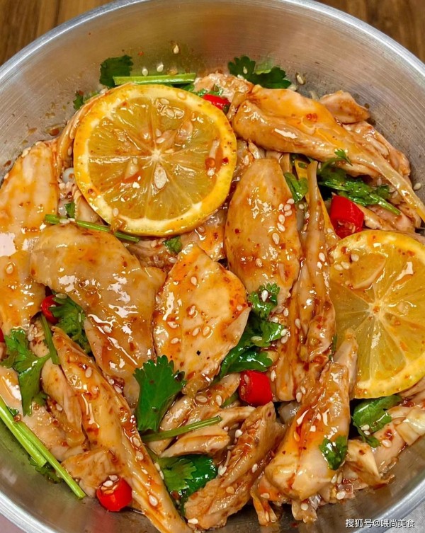 步骤3、淋在鸡丝上,放切好的柠檬片,香菜小米辣黄瓜丝拌匀即可。