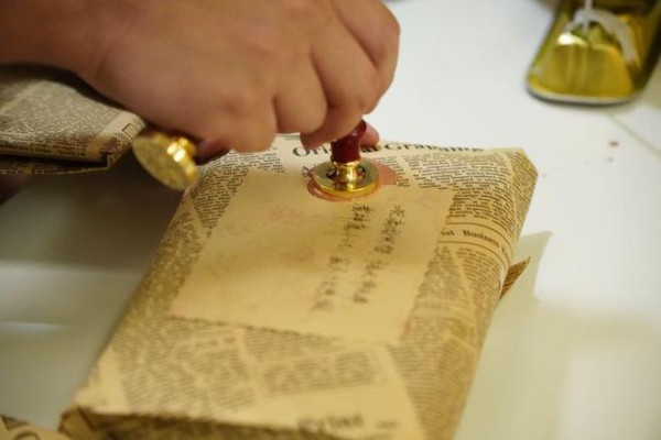 最具人气的“旧书焕章”互动环节,将活动氛围推向高潮。桌台上,牛皮纸、火漆蜡粒、铜质印章整齐排列,参与者在留言纸上写下对下一位读者的寄语,再用牛皮纸包装旧书。参与者将蜡液倒在包装纸上,稳稳按下印章,待蜡印凝固,带着独特纹路的火漆章便成了每本书的“专属身份证”。随后,封装好的旧书被一一送入“漂流书架”。参与者带走旧书,体验交换的乐趣。