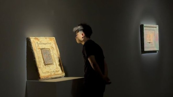 展厅中,几件色彩鲜艳的作品在灰暗色调的空间中格外突出。郁涛介绍,这些作品创作于2017年至2019年,历时近三年完成。当时,他发现自己以前的作品大多色调灰暗,于是决定尝试创作一些明亮、生动的彩色作品。这批作品约有二三十件,他依然使用矿物质颜料,通过筛子将颜料筛在作品表面,再用胶固定,形成颗粒感的视觉效果。这种颗粒与光源的折射效果,让作品在不同光线下展现出丰富的质感和微妙的变化。