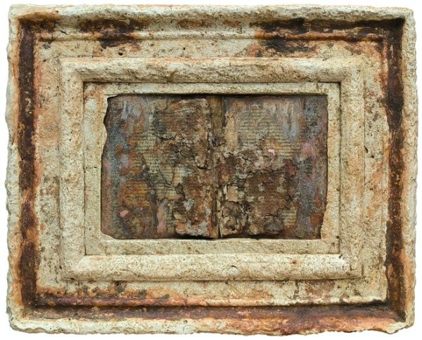 展览现场的其中一个展厅里,有几件被放置在展台上的作品,铁锈色的书本与乳白色的画框相互映衬,形成了一种强烈的视觉对比。作品的整体表面呈现出类似石头的质感,仿佛是刚刚从土里挖出的“化石”,坚硬又残破。这种独特的质感和色彩搭配,让整个作品散发出一种古老而神秘的气息。它们到底是什么材质?又是在怎么样的环境中被塑造出的?