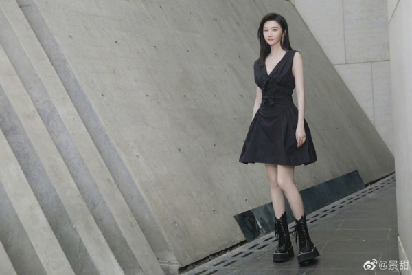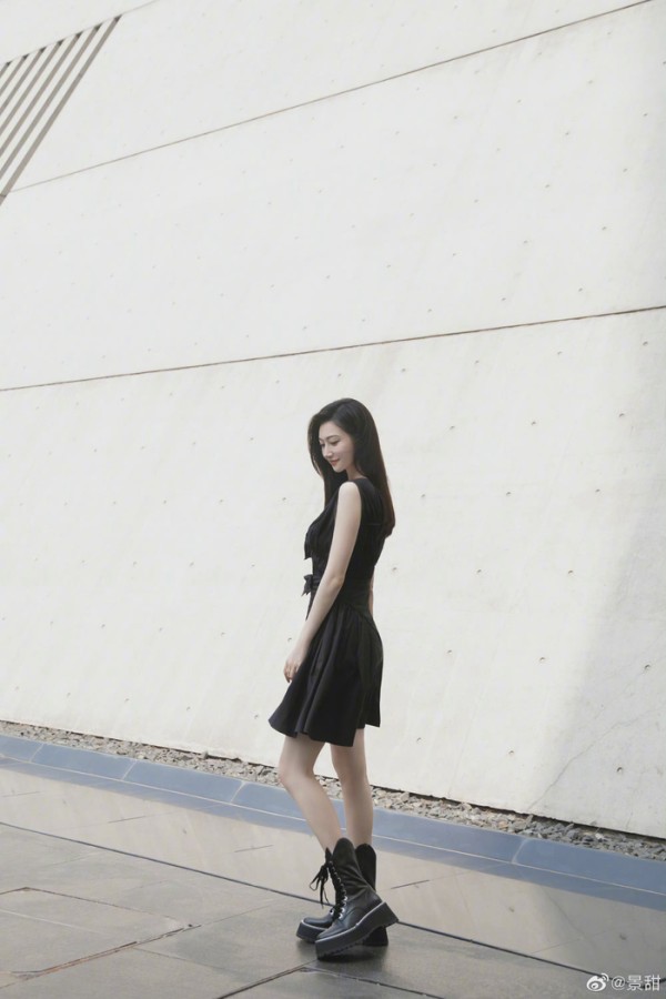 4 / 9 景甜微博更新:珍爱生活中的每个瞬间!黑色深V连衣裙搭配马丁靴,性感酷飒的姐姐@景甜