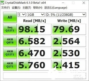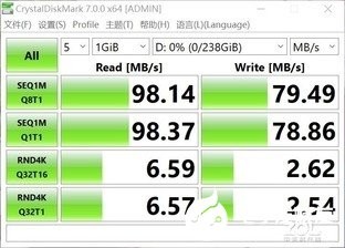 我们可以看到,两次连续读取速度基本都维持在了98MB/s,写入则达到了80MB/s左右,依旧比较稳定。