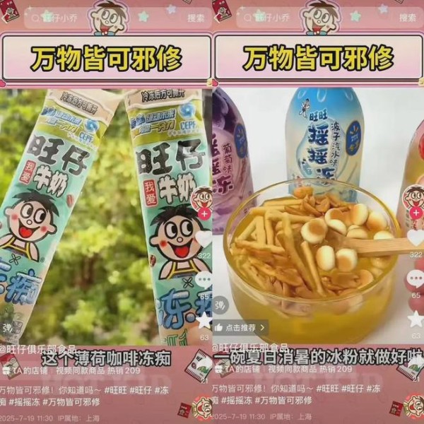 旺仔牛奶被网友“邪修”成各种美食后,品牌亲自下场为新品“冻痴冰激凌”开发薄荷咖啡“邪修”配方。将摇摇冻放进冰箱,它就化身成了夏日必备的冰粉。