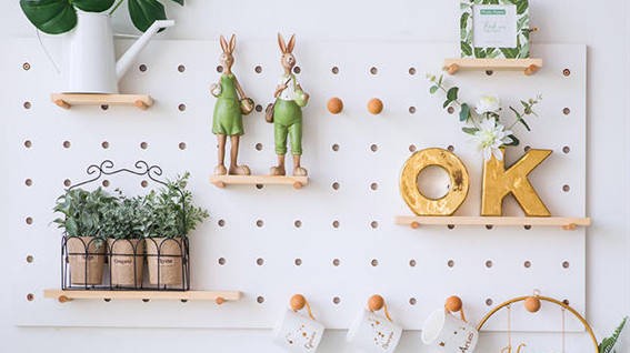 1.洞洞板洞洞板不需要在墙上打动洞,本身板面上有规则的小洞,可以将小木条插入空中,用来悬挂各种零碎小物品,例如钥匙串,杯子,勺子,毛巾等。