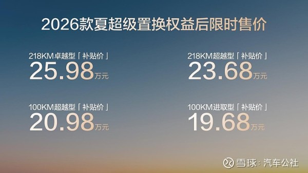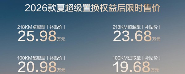 2025年11月4日,2026款夏正式上市,此次共推出4款车型,限时超级置换价19.68—25.98万元。仅需中级SUV的价格,就可享有超越30万级的豪华配置。