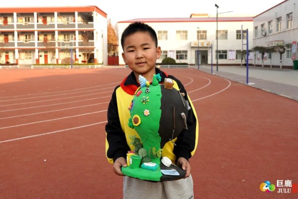 该校一年级学生孟令毅制作的“废墟地球·绿色地球”在孩子心中埋下了一颗环保的种子。“我创作这个作品就是想呼吁大家不要乱扔垃圾,要爱护环境,保护人类赖以生存的家园。”