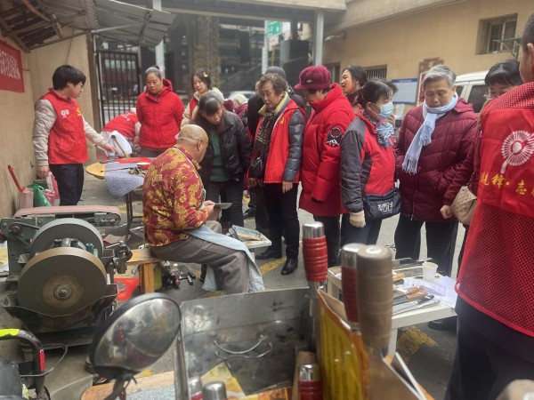除了春联、义剪摊位,现场还有免费磨刀服务。磨刀师傅细心地为居民们除去刀具上的锈斑,并不时用砂轮打磨菜刀,不一会儿,一把钝刀就变得锋利无比。“菜刀钝了,想找个磨刀的地方都很难,社区的这项服务真贴心!”居民们纷纷夸赞社区的暖心服务。