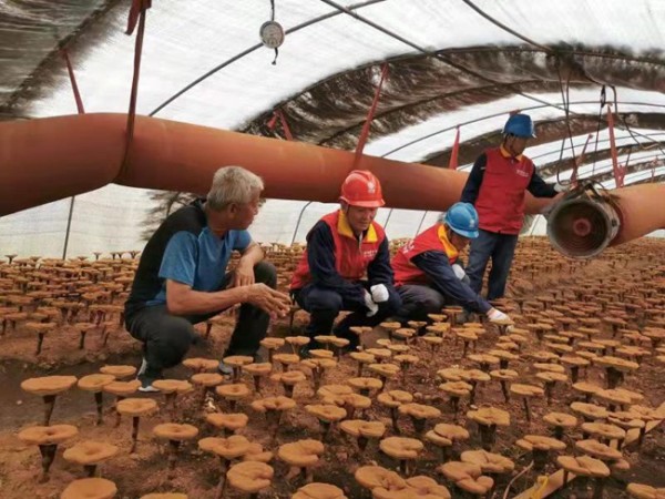 圖為國網吉林延邊敦化市供電公司共產黨員服務隊員在農村生態靈芝種植基地向電力客戶了解用電需求並介紹安全用電常識。(張晨攝)