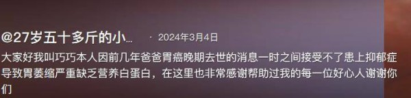 胃萎缩开始时使得巧巧无法正常消化和吸收食物,最终演变成无法进食的严重情况,导致她迅速瘦弱,几乎骨瘦如柴。巧巧的患病经历其实与家庭的变故息息相关。她的父亲在几年前确诊为胃癌晚期,并在不到半年内离世,留给巧巧和她的弟弟两个人相依为命。父亲的去世给她带来了巨大的心理冲击,巧巧陷入了深深的抑郁之中。