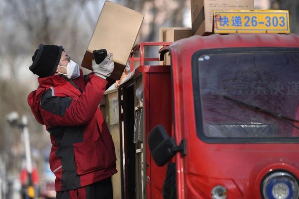 12月23日,在兰州市城关区,一名快递员从快递车上搬运快件。