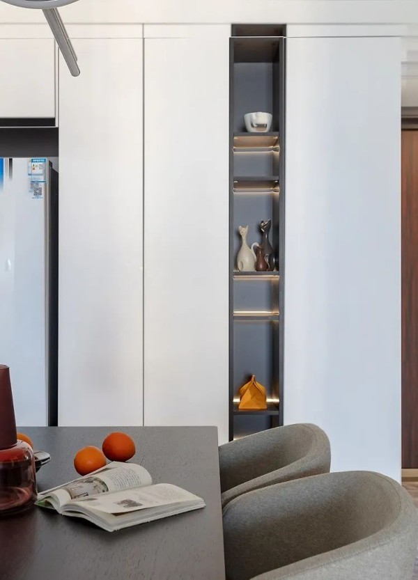 餐厅延续整体的高级感深灰调柜门和浅色石材的自然纹理进行对比融合质感展现无遗主卧尤为特别的低矮床使小空间也能获得好的视野