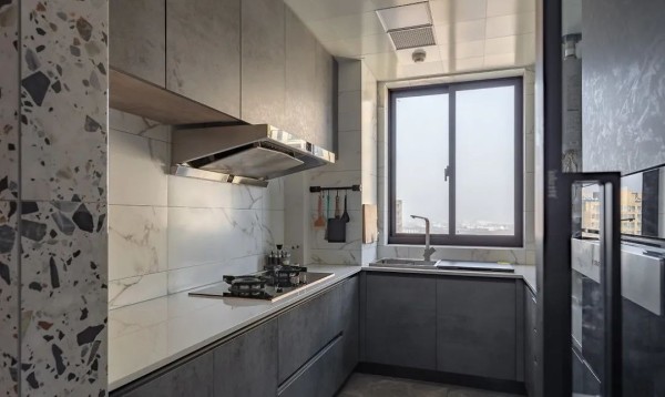 一侧的餐边柜设计储物充足又美观实用厨房