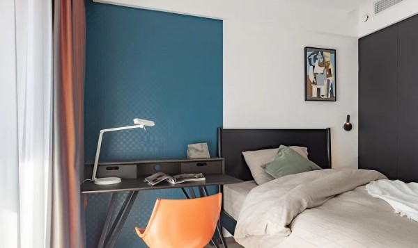 地台式的床增加了整体的储物空间又安全有趣男孩房哑黑色的床衣柜书桌大气内敛呼应且统一性搭配亮橘色的单人椅神秘而又开放