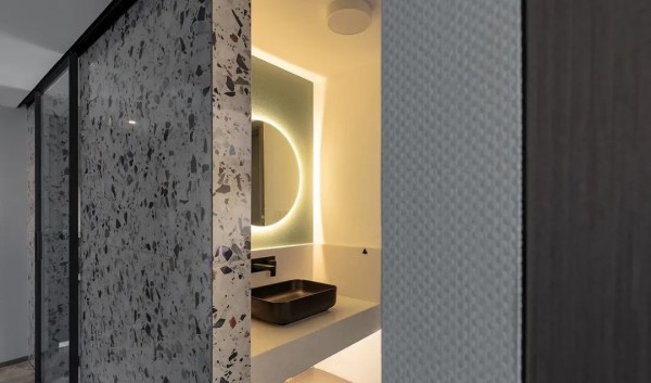 水磨石状的色彩斑点有如画家随性的笔触复古且富有质感低饱和度的莫兰迪色柔和又细腻悬空的大理石纹路洗面台+背光圆镜烘托出一个简约优雅的画面
