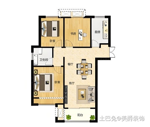 小3室将最小的房间面积改动成书房,这样空间利用起来比较合理