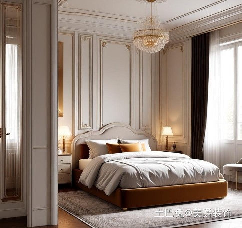 卧室,以象牙色墙面和精致木门为特色。柔软的天鹅绒帷幔与典雅家具相得益彰,水晶吊灯散发出柔和光芒,营造出奢华而温馨的氛围。