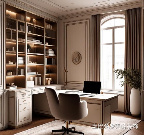 书房融合了古典与现代风格,深棕木书架与金色装饰相得益彰