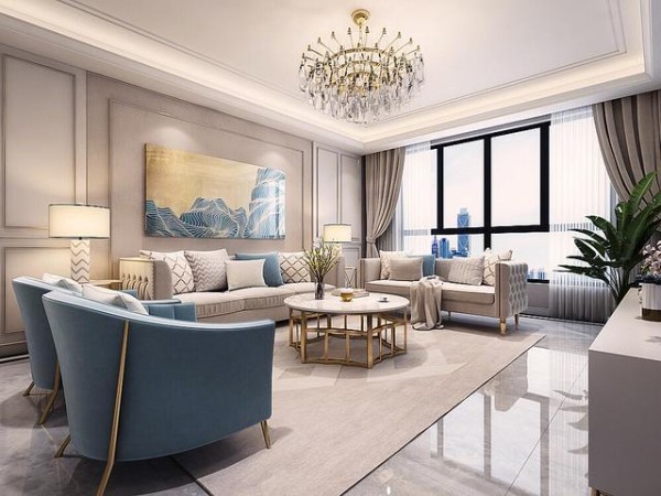 颜色搭配方面给人的感觉非常清新,淡蓝色的墙布和沙发颜色形成了一种呼应,搭配着大理石桌几,不仅有一种小清新的感觉,还有轻奢的感觉在里面。