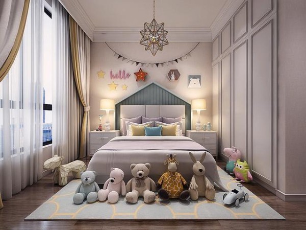 儿童房的床头墙面贴了浅色的壁布,顶部没有做吊顶,但使用石膏顶角线和石膏板的效果,仍然很不错!