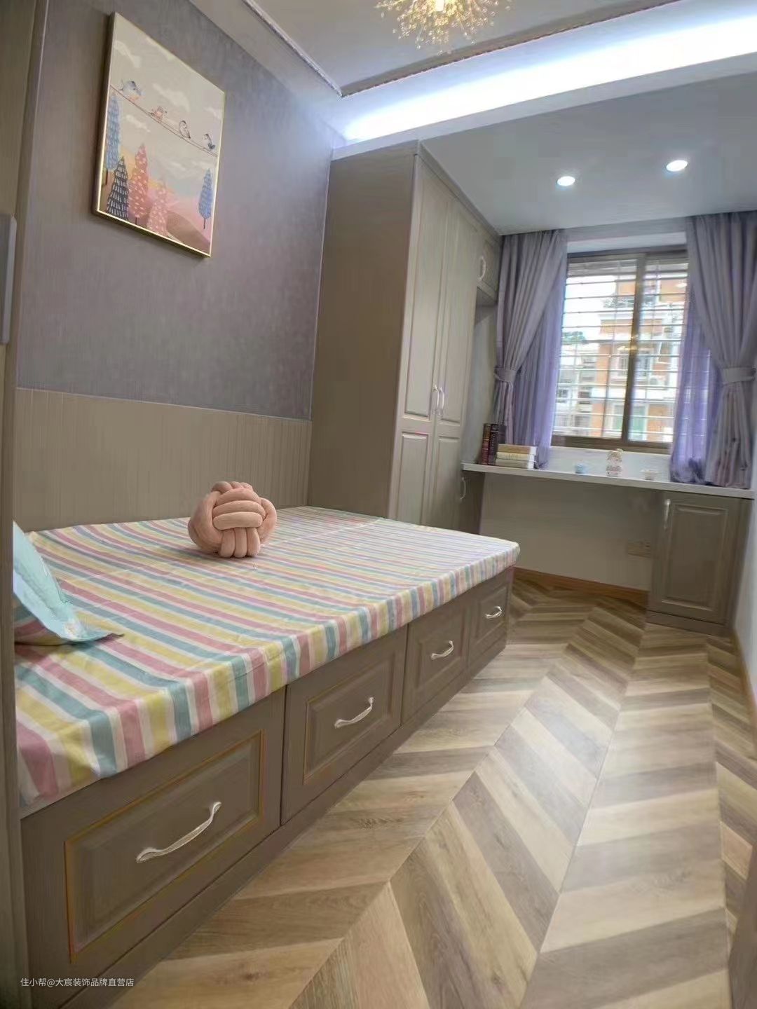 儿童房采用榻榻米的形式不仅可以安逸入睡,还增加了超强的收纳储物空间,嵌入式的衣柜与书桌一体化,完美实现多用化的形式,更加节省了空间,使得空间不会那么的狭隘。充满诗意的装饰画小而温馨的家中,总有那么一种期盼和牵挂,在小小的房子里也能享受舒适静谧的时光。