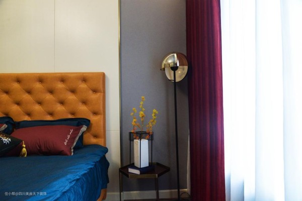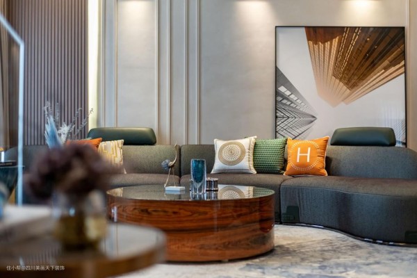 确定空间的主色调后,在局部进行小面积的跳色形成色彩上的反差也必不可少,像高贵的孔雀蓝、像经典的爱马仕橙,它们能为沉稳的空间中注入一丝灵气,最大化的彰显轻奢的气质。